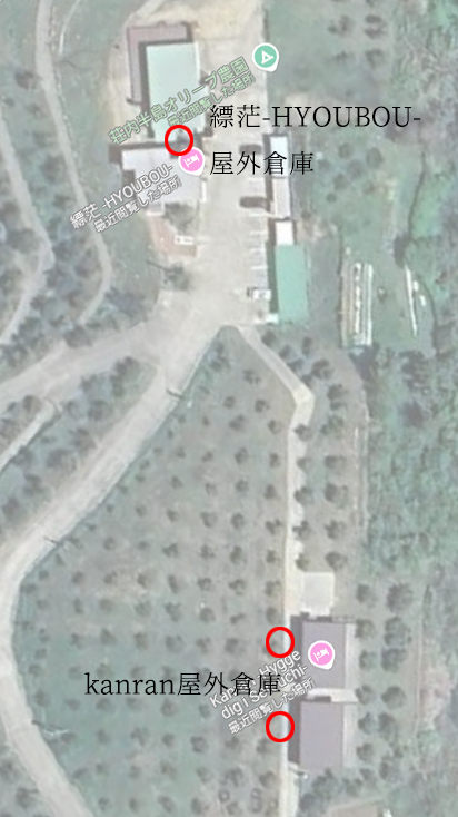 Kanranと縹茫-HYOUBOU-は、各施設に備品保管用のエリア(倉庫、もしくはキッチンの棚等)と、外部に集約的な保管庫、あわせてオリーブの搾油室の中に冷凍庫があります。